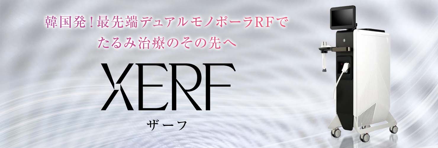 XERF(ザーフ)は、6.78MHz+2MHzのデュアル周波数を採用した最新のRFたるみ治療機です。同時照射の技術により脂肪層の深部にまで熱を浸透させ、引き締めるだけでなくリフトアップ効果も期待できます。